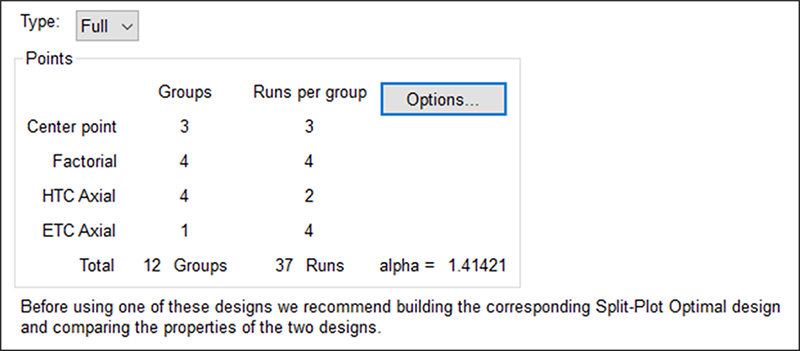 実験の労力に関して言えば、分割法は非常に効率が良いといえます。実験が簡単になるほど、それだけHTC 因子の効果を決定する精度と検出力が低くなるという点に、留意してください。サンプルサイズを調べる power や fraction of design space(FDS)ツールを使用して、実験の試行数が十分か否かを必ず確認し、無作為化による制約で検出力と精度が低くならないようにしてください。これらのツールについては、他のチュートリアルおよびウェビナー(https://statease.com/training/webinar.html)で説明しています。それから、実験の計画と解析用にまとめられた手順に従ってください。