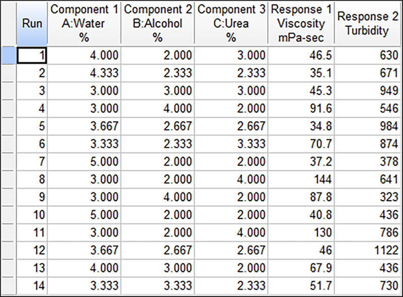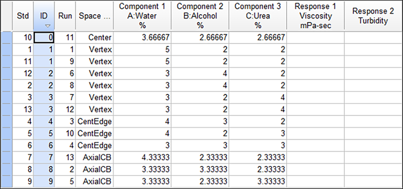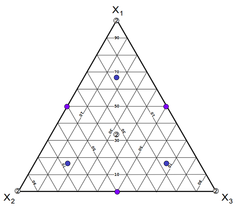 実験には、単体格子(simplex lattice)と呼ばれる標準的な混合計画を選択します。軸上のチェック・ブレンド(検査用混合試料)と全体の重心を計画に加え拡張します。各頂点と全体の重心は繰り返され、実験を行う配合比は合計で 14 となります。