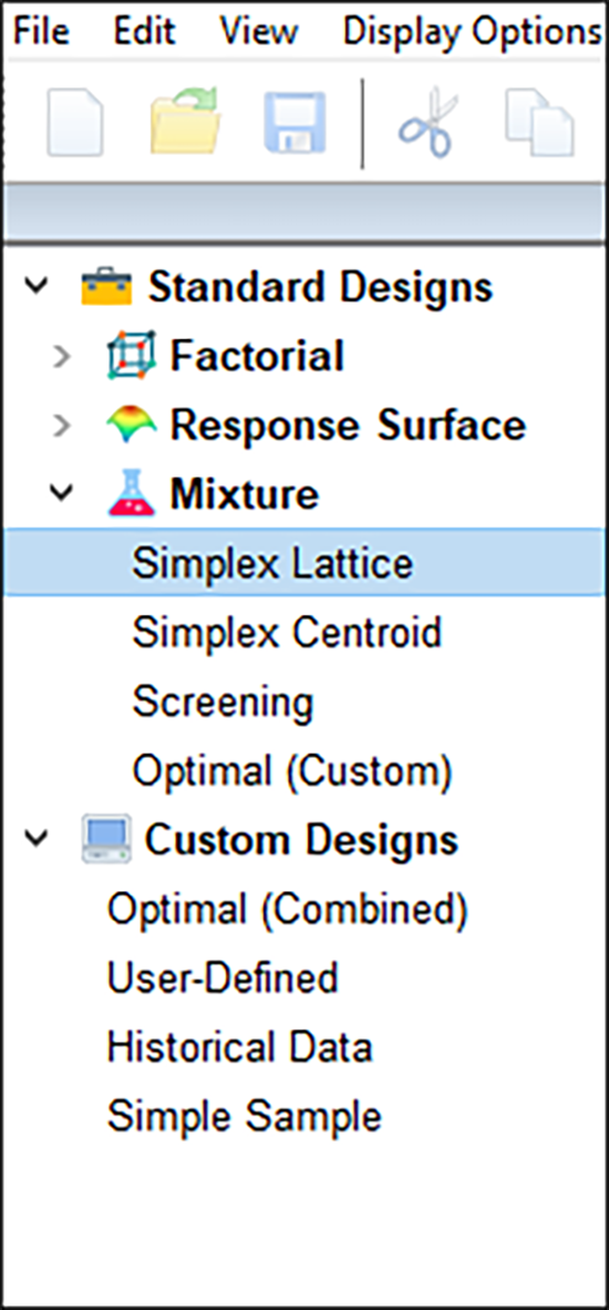Design-Expert のアイコンを見つけたら、それをダブルクリックしてプログラムを起動してください。起動画面で “New Design” をクリックして開始します。画面左にある “Mixture” をクリックしましょう。デフォルトでは、このチュートリアルで使用する Simplex Lattice が既に指定されています。