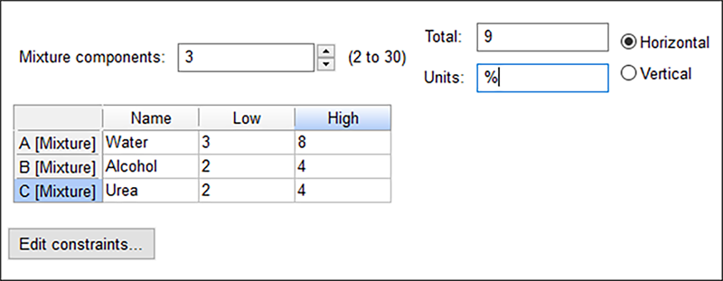 設定画面が表示されたら、Mixture Components を “3” に変更します。それぞれ以下のように、Name、Low、High フィールドに Tab キーで移動しながら、適宜入力を行ってください。Total フィールドには「9」を、使用する Units には「%」を入力します。
