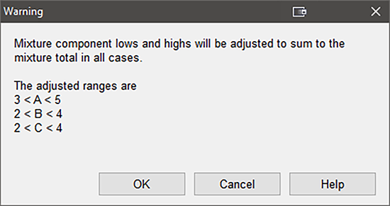| ※ 注意 多くの混合計画ではこの時点でシンプレックス法が適さないという警告が示されるかも知れません。 ![]() 混合領域がシンプレックスでない場合に表示される警告 その場合、Optimal design(最適計画)を選択してください。 このオプションの詳細については、『多因子における RSM』チュートリアルを参照してください。 |