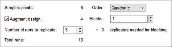 “Augment design” のチェックを有効にしておくことで、Design-Expert の計画点に全体の重心と、軸上のチェック・ブレンドを加えることができます。