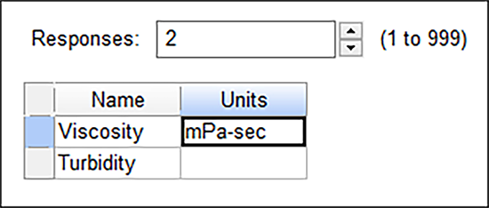 “Next” をクリックして、計画プロセスの次の段階に進みましょう。Responses のドロップリストでは “2” を選択します。次に、応答の名称(Name)と単位(Units)をすべて下記のように入力していきます。