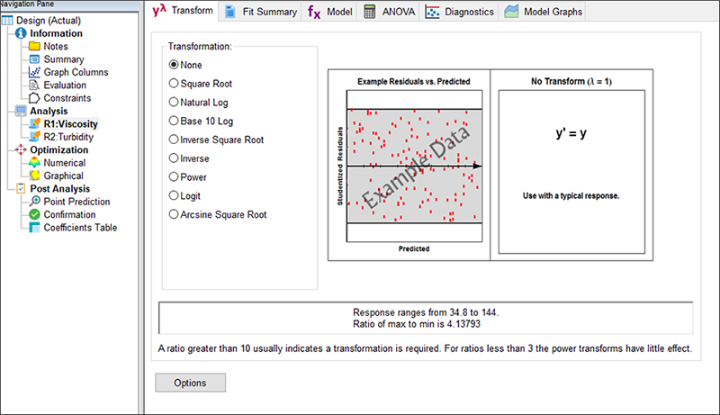 まず始めに、この応答データに数学的変換(Transformation)を実行するかどうかを検討します。これにより、分析の統計的特性が改善されるケースもあるからです。例えば、応答の変動幅の大きさが数桁の違いで存在する場合は、対数(Log)スケールを使うと通常はうまく分析できます。この事例を見てみると、応答の最大値(Max)と最小値(min)の比率は、4 をわずかに上回るに過ぎません。この比率は、数学的変換が必要となるほど大きな値ではありませんので(画面下の注釈を参照)、選択肢はデフォルトで指定された None のままで結構です。また、coding for analysis(分析のコーディング)についても、pseudo のままで結構です。この指定により実際の成分の水準尺度が 0 – 1 に変更されるからです。