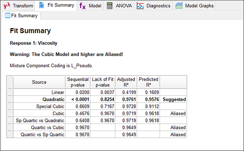 次に、“Fit Summary” タブをクリックしてください。Design-Expert はここで、線形(linear)、2次(quadratic)、特殊3次(special cubic)、完全3次(full cubic)の各多項式を応答にあてはめます。
