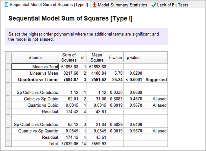 ここで、Design-Expert が提示する最初のテーブルのモデルに注意してください。これは、以下内容を総括したものです。