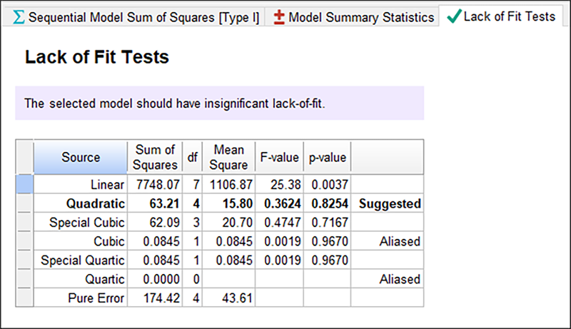 次に “Lack of Fit” タブをクリックして、次のペインに移動しましょう。このテーブルの内容は、繰り返し測定の残差誤差(residual error)と純誤差(pure error)を比較するものです。もし、残差誤差が純誤差を上回る場合、その残差にはずれ(deviations)が存在することになりますので、より適切なモデルを使用して、それを取り除くことができる可能性があります。線形モデルの残差誤差は、不適合度(当てはまりの悪さ)が有意であることを示しますが、2次、特殊3次、完全3次においては、不適合度は有意ではありません(当てはまりは良い)。