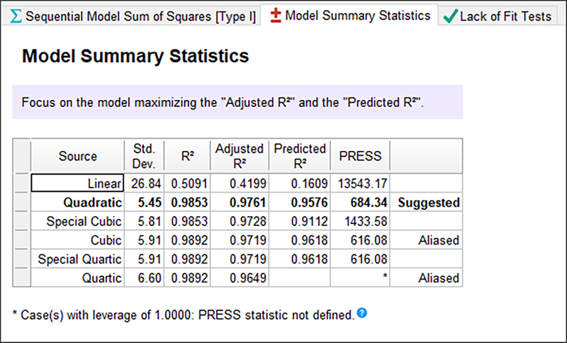エイリアスされた3次モデルは除外するとして、標準偏差(“Std Dev”)の値が低く、R二乗(“R-Squared”)統計の値が高く、“PRESS” の値が低い2次モデルが最適となります。