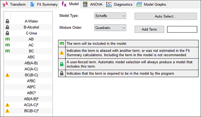 | ※ 注意 ここで、スクリーンチップスボタン また、チップス画面に記述されているように、Design-Expert には、“Manual” の代わりに、Auto Select… ボタンからアクセスできるいくつかの自動削除アルゴリズムが用意されています。これを試してみたい場合は、ボタンをクリックしていずれかを選択してください。基本ルールに従って推奨される内容をポップアップで確認することができます。ただし、統計や懸案となっている事項の背景にある知識に基づいて、削減することに意味があると確証が持てない限り、混合モデルの削減はお薦めしません。これらについて学びたい場合は、ワークショップ(Mixture Design for Optimal Formulations)に参加ください。 |