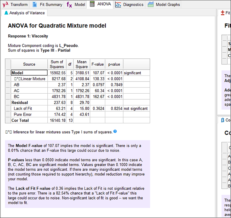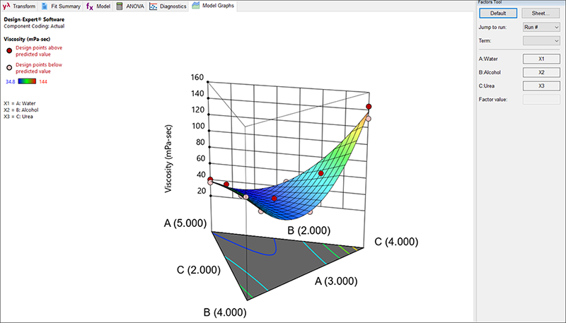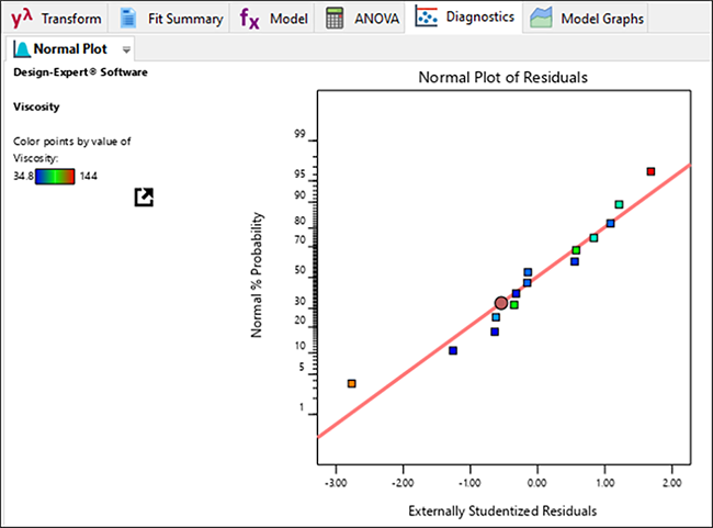 Design-Expert の Analysis ブランチに移動し、“Viscosity” ノードをクリックします。ウインドウの上部に配置されているタブを通じて、分析を進めることにしましょう。