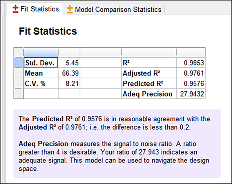 ここに示される統計の内容は、既にその殆どは “Model Summary Statistics” テーブルでも見ていますが、いずれも問題無さそうです。適切な精度を判定する “Adeq Precision” の値は 27.943 となっており、要件を十分満たしている点に注目しましょう。