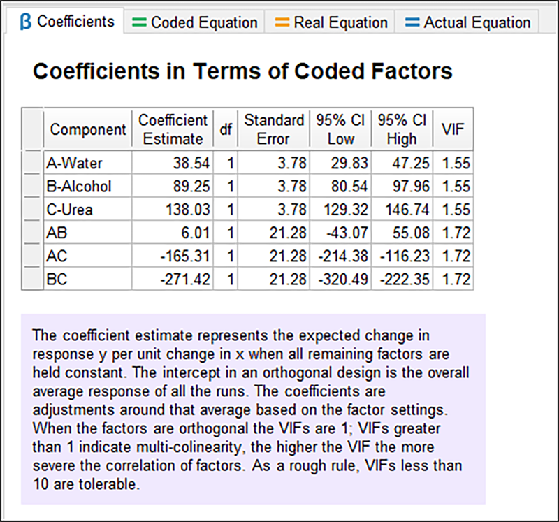 | ※ 注意: このモデルの F 値は高く、確率値(Prob > F)は低くなっています。Design-Expert による注釈で示されているようにこの結果は良好です。この確率値は、各項の有意性を示しています。 P.S.混合モデルには intercept(切片)項が含まれていないため、主効果の係数(線形項)に応答全体の平均が組み入れられ、これらは一緒にまとめて検定されます。 |