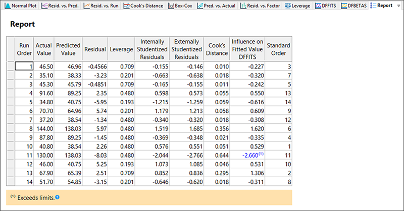 推奨範囲を上回っている場合、青色(とアスタリスク)で警告表示される点に注目しましょう(Standard Order の 11 番の DFFIT 値)。Help で詳しく説明されているように、DFFIT は、ある応答が削除されたときに生じる各予測値の違いを測る指標です。警告の発せられた診断はこれ1つしかありませんでしたので、恐らく危険性の原因とはならないでしょう。しかし詳細に調べてみると、それが粘度応答の最も高い値のひとつであることが分かります(Actual Value = 130.00)。従って、実験者はこの応答の精度を再確認することをお勧めします。
