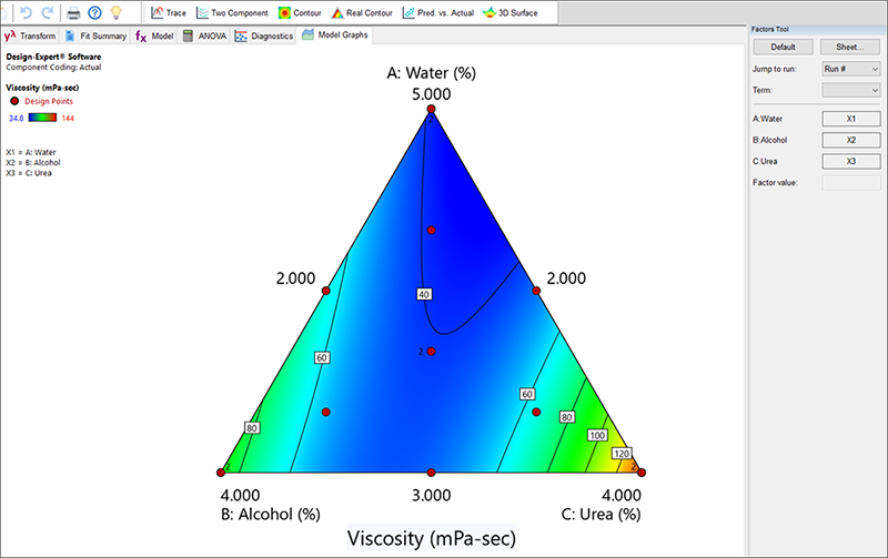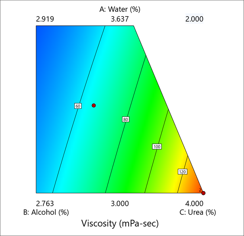 Design-Expert には、設計空間に含まれる実際の点がすべて表示される点に注意しましょう。この事例で表示されているのは、混合物を構成する3成分の関数として表される粘度のプロットです。このスライスには、等高線プロットの中央に赤のドットで示されているように2つの重心と数字の “2” が含まれています。