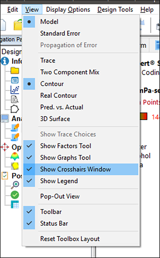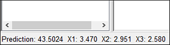 マウスのカーソルを等高線グラフ上に移動してください。カーソルの形状が十字(+)になります。Design-Expert の画面の左下隅に、予測される応答と座標が表示される点に注目しましょう。