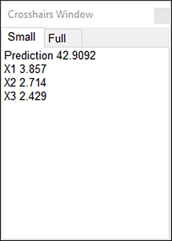 | ※ 注意 Full ボタンをクリックすると、以下に示すように、座標と予測応答に加え、信頼区間と予測区間も表示できます。 ![]() CrosshairのFull表示 |