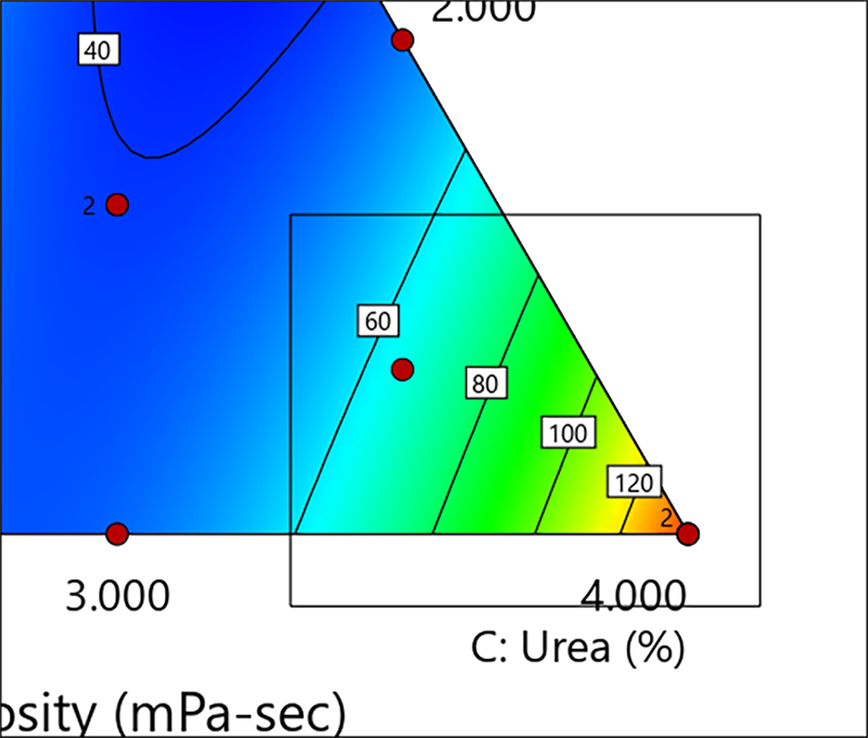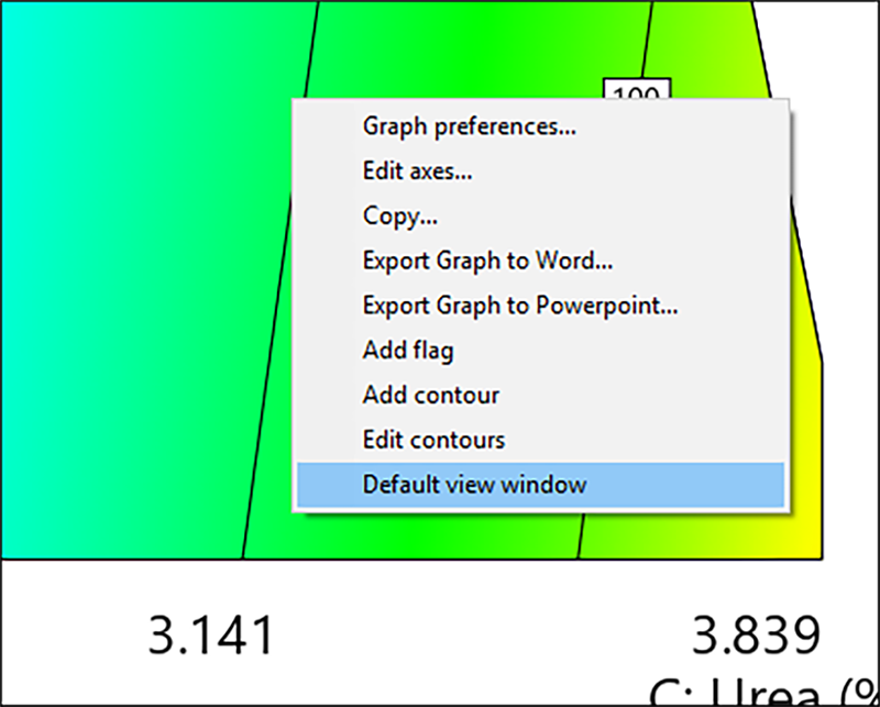 仮に、粘度の最高値に関心があるとしましょう。マウスの左ボタンを押したまま、等高線グラフの右下隅にドラッグしてください。