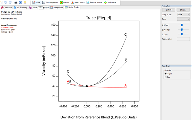 | ※ 注意: 実験領域が三角の単体で構成されているこの事例の場合は、Piepel か Cox のいずれの Direction をとるか迷うことは殆どありません。“View” -> “Trace Direction” を選び、“Cox” を選択し確認を行ってください。あるひとつの成分量が増えるに従って、それ以外の成分の合計量は減りますが、それらの構成比は依然として一定のままです。化学者であれば、反応化学量論を保持できるので、こちらを好むかも知れません。しかし、この方法でプロットすると、混合成分の制約条件が強い場合(化学反応のための溶媒など)は、トレースの先が断ち切られてしまいます。従って、混合計画の専門家は、現実の比率を一定に抑えることはできないけれども、Piepel を選ぶほうが最大限広範囲な実験空間をカバーできるため、Cox よりも役立つプロットを作成できると論じています。このため、Design-Expert では Piepel によるプロットを推奨しています。さらに詳しい情報につきましては、Help で “trace plot” を検索してください。 P.S. トレースプロットは、開始点をどこにするかによって大きく変化します(デフォルトは centroid/中心)。Factors Tool のスライドバーを動かしてご自身で確認してみてください。終了したら “Default” をクリックします。トレースが一次元のみであることが考慮されるため、とても実用的ではありますが応答曲面は表示されません。3D 応答プロットは、分かりやすい曲面を描画します。3D 応答プロットは最も望ましい混合成分を決定するための、まさに究極のツールなのです。 |