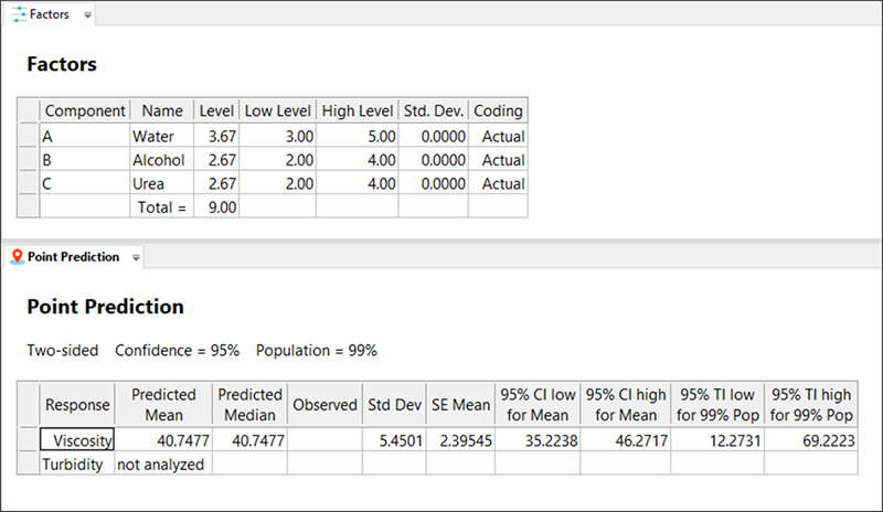 現在、単体の重心に位置する特定のブレンドの予測応答が、表示されているはずです。Factors Tool は、Point Prediction Tool とともに表示されます。必要に応じて、上部の境界線をクリック&ドラッグして、ツールを移動させてください。component gauge 上のスライダーをドラッグすることで、別のブレンドも表示させることができます。この際混合物では、3つの成分の内2つだけを個別に変更できる点に注意してください。ここで、粘度の値が 43 になる組み合わせを、見つけることができますか(ヒント:尿素の値を少し押し上げてください)?ただしこの操作は、次のチュートリアルのセクションにて Design-Expertの最適化機能を利用して詳しく説明するので、あまりのめり込まないでください。