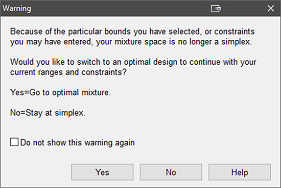 | ※ 注意 多くの混合計画ではこの時点でシンプレックス法が適さないという警告が示されるかも知れません。 ![]() 混合領域がシンプレックスでない場合に表示される警告 その場合、Optimal design(最適計画)を選択してください。 このオプションの詳細については、『多因子における RSM』チュートリアルを参照してください。 |