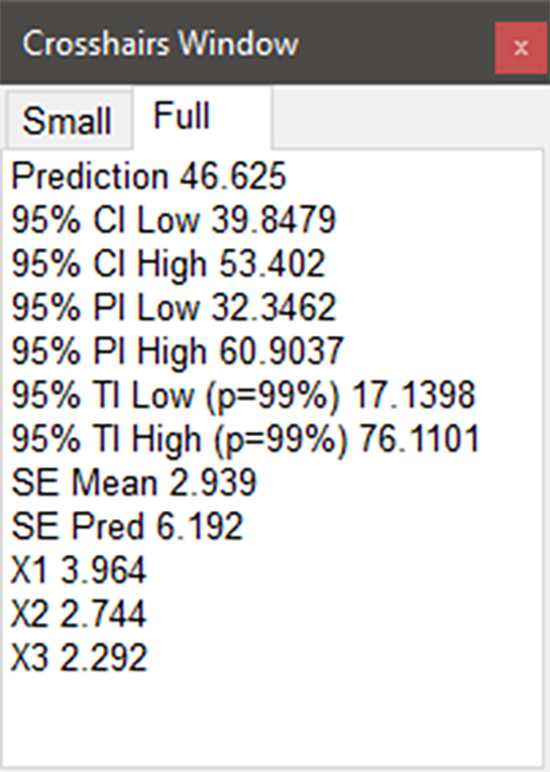 | ※ 注意 Full ボタンをクリックすると、以下に示すように、座標と予測応答に加え、信頼区間と予測区間も表示できます。 ![]() CrosshairのFull表示 |