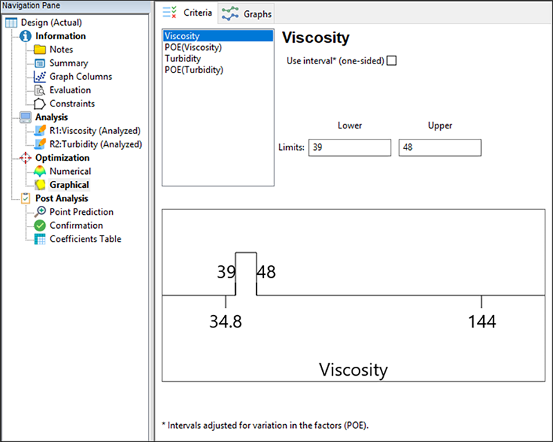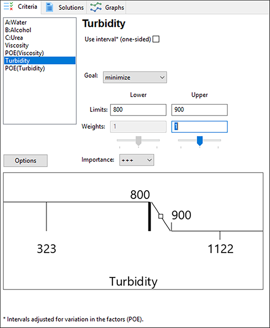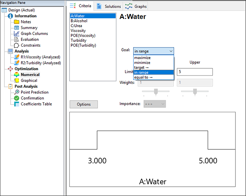 Design-Expert では、成分と誤差の伝播(POE)を含むすべての変数に関して、基準を設定することができます(POE に関しては後ほど説明します)。応答の範囲はデフォルトで実測値の両極値に限定されます。