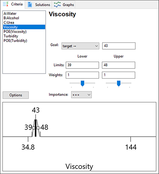 上記の応答プロットをすべて重ね合わせることにしましょう。Optimization の “Graphical” ノードをクリックしてください。Viscosity の応答について、Limit フィールドの値が設定されていない場合は、Lower に「39」、Upper に「48」と入力してください。