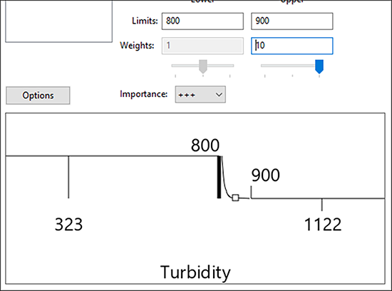 次に、応答 “Turbidity” に進み、Limit フィールドで次の値が事前に設定されていない場合は、Upper に「900」と入力してください。これも最小化であるため、Lower には何も入力しません。