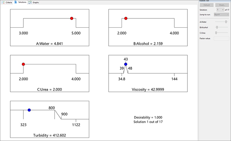 ランプ表示は、それぞれのグラフを一目で理解できるようにまとめたものです。各ランプの点は、その解の因子設定、もしくは、応答予測を表します。点の高さは、望ましさの度合いを表します。Factors Tool のドロップダウンメニュー(1, 2, 3, …)から様々な solution を選択し、その点の違いを確認してみてください。成分の各水準をあらわす赤で表示されているドットは左右に大きく変動しますが、2つの応答はそれぞれ指定された目標に留まっていませんか(Desirability = 1)?グラフ上部付近にある最後の解 (この事例では Solution 番号 17) をクリックしてみてください。以下の様になっていませんか?