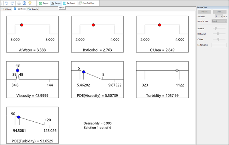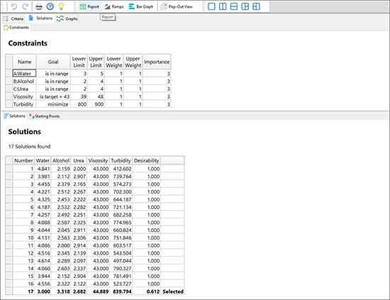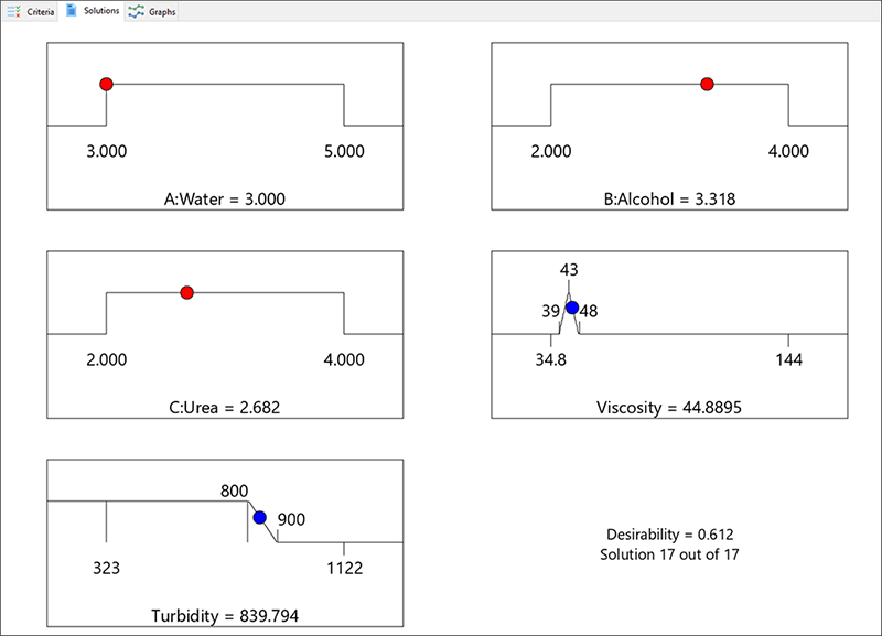 解を調べていく中で、上記の局所的最適解が明らかになった場合は、粘度が目標値から外れ、濁度も過剰になるため、高温におけるオプションよりも望ましさが低くなることに注意してください。