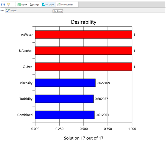 上記の棒グラフは、各変数が設定された基準をどれだけ満たし、各応答を組み合わせた全体の望ましさは、どの程度であるかを示しています。値が 1 に近いほど好ましいものとなります。これは最善の解決策ではありません!