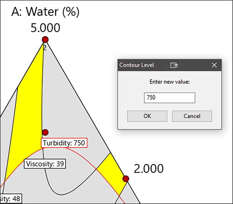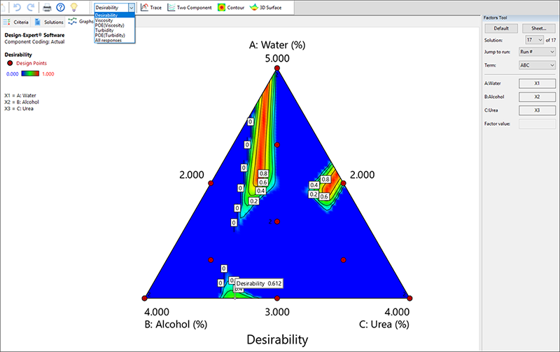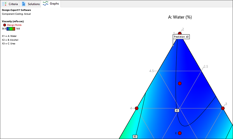 次に、三角形の混合空間の上部にある最大のスイートスポット(最大の領域)にフラグが移動するまで、solution のドロップダウンリストを選択してみましょう。この望ましさ(スイートスポット)に対応する応答を表示するには、Response のドロップリストの矢印を押して、“Viscosity” を選択してください。