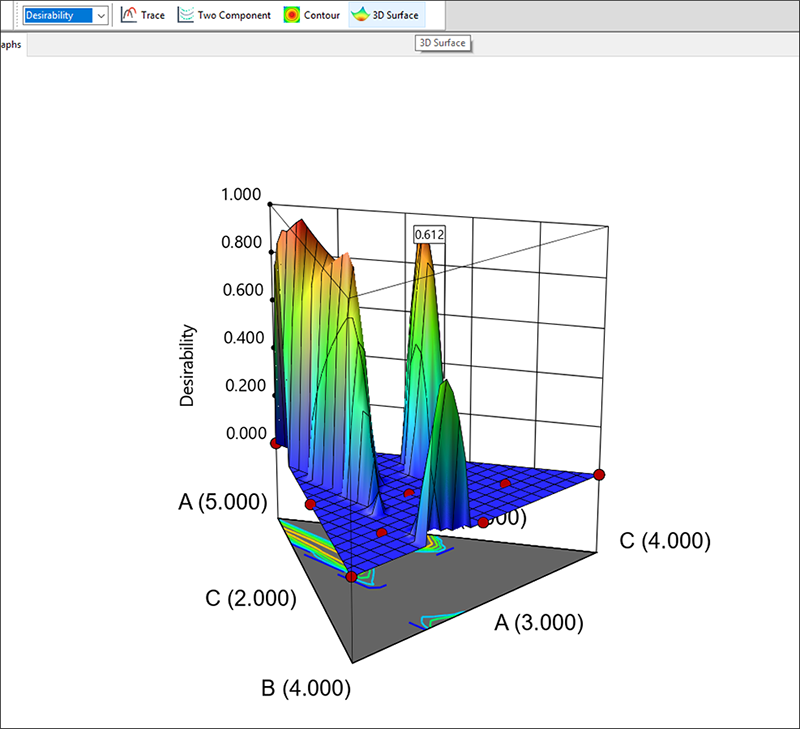これで、特定の配合領域に広がる望ましさが高水準を保持しているひとつの高い山(1)を確認できるはずです。もう1つの高い点(2)も目標を達成できますが、ここでは配合を厳密に調整する必要があります。もうひとつのピーク(3)は望ましさの基準に達していません(低いです)。