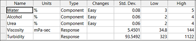 Std. Dev. 列内に、各因子の標準偏差を次のように入力します。Water:「0.08」、Alcohol:「0.06」、 Urea:「0.06」