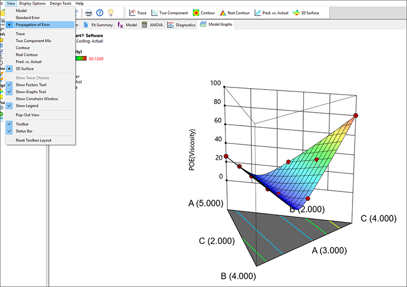 これで、各応答に関するグラフを作成することで誤差の伝播を計算できます。まず、Analysis の “Viscosity” ノードを選択して、“Model Graphs” タブをクリックしてください。続いて、前回グレー表示で選択できなかった “View” -> “Propagation of Error” を選択します。同じく、メニューから “3D Surface” を選択してください。現在画面は以下に示すスクリーンショットと同じになっているはずです。