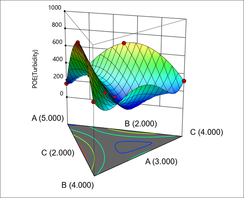 曲面で最小値をとる部分が、粘度応答に対して伝播する誤差の量が最小となるところです。これらの最小値は、配合成分量のばらつきに対して最も堅牢となるモデルグラフの平面領域に現れます。