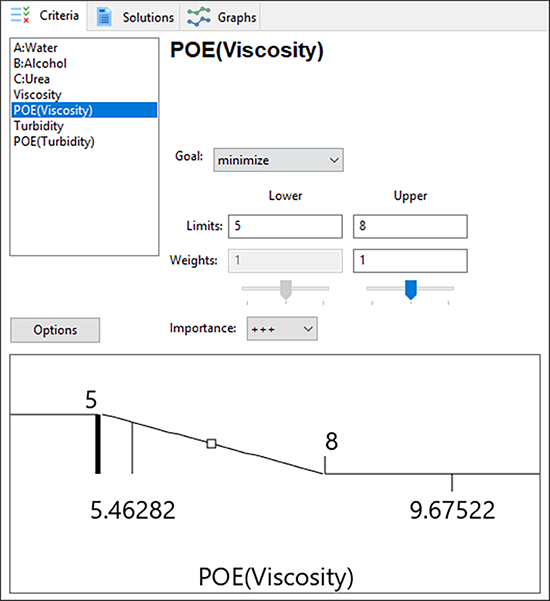以上で、2つの応答に関する最適条件を見つけることができましたので、前に戻って誤差の伝播に関する基準を加えることにしましょう。Optimization の “Numerical” ノードをクリックしてください。“POE (Viscosity)” を選択し、Goal に “minimize” を選択したら Limits の Lower に「5」を Upper に「8」を指定してください。