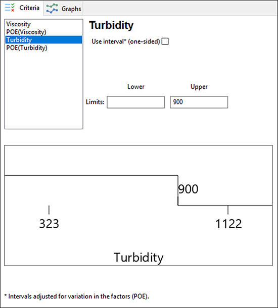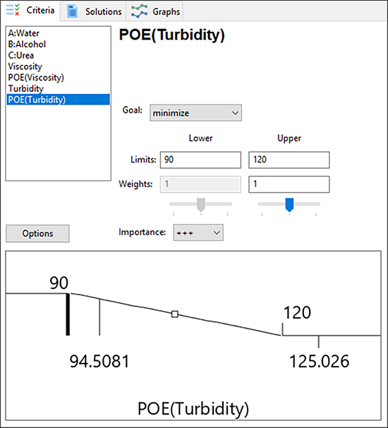 “POE (Turbidity)” を選択し、Goal に “minimize” を選択したら、Limits の Lower に「90」を Upper に「120」を指定してください。