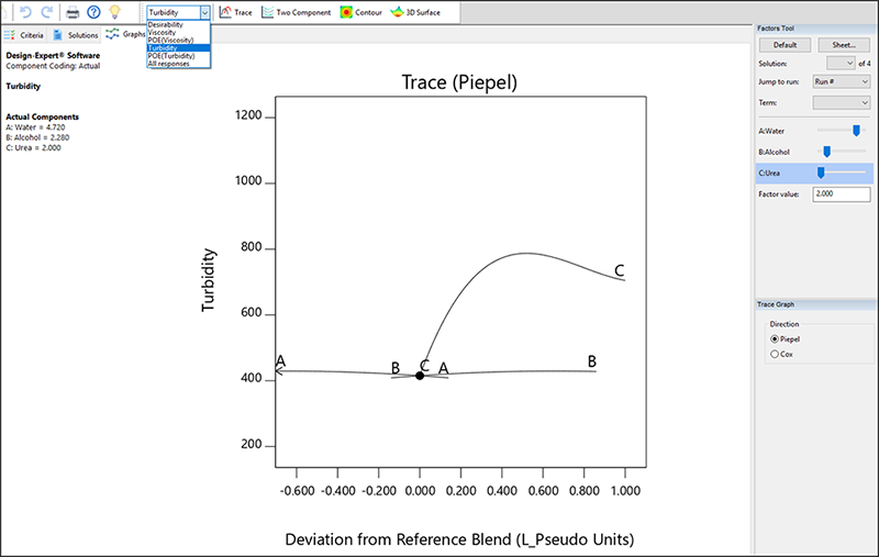 数値計算による最適化の Graphs から引き続き、“All Responses” をドロップダウンから選択します。ここでは、すべての応答の俯瞰図と、解を求めた手段が示されます。望ましさのプロットは、前とそれほど変わっていないように見えることに注意してください。これは POE 基準を追加しても、それほど結果に影響を与えないからです。しかし最適点周辺の応答の感度を調べるのには良い機会です。Response を “Turbidity” に変更して、観察してみてください。次に、Graphs Tool パレットから “Trace” を選択します。