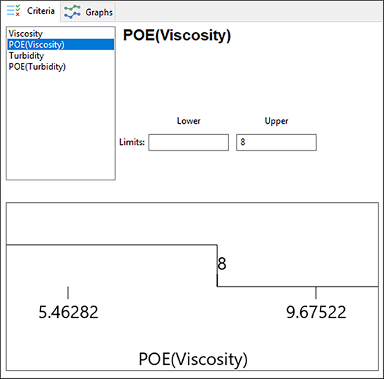 次に、応答 “POE(Viscosity)” をクリックします。Limit フィールドが設定されていない場合は、Upper に「8」と入力してください。Lower には何も入力しません。単純に最小化する場合は、グラフによる最適化で必要ありません。