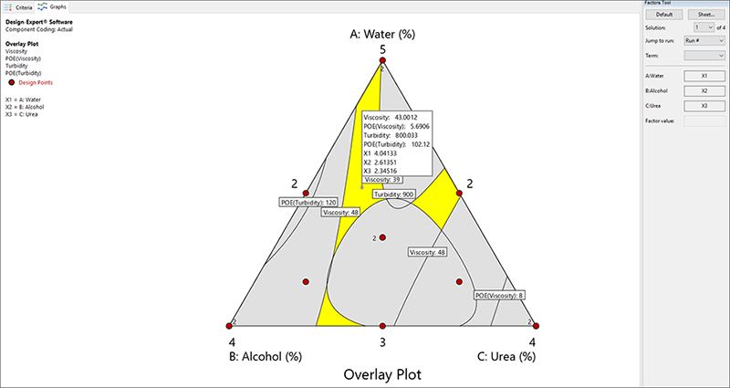Design-Expert を使うことで、複数の成分が複数の応答に与える影響の違いを探索することができます。望ましさを最大限にする解を素早く見つけるには、数値計算による最適化を使用します。最終報告書にまとめるには、最適条件の「スライス」を重ね合わせたグラフ化されたオーバーレイプロットを使用します(成分それ自体に対しても目標を設定できることを忘れないでください。例えば、この事例では、価格の安い水の量を最大にするのが賢い選択になるかもしれません)。