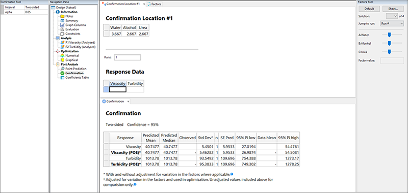 | ※ 注意 Criteria タブの Turbidity に “Show Interval (one-sided)” を指定し、さらに “Graphs” をクリックします。これにより、信頼区間によって境界が押し出され、モデルに基づく平均予測で占められた不確実性がこの混合実験から導き出されました。 ![]() 濁度に重ね合わせた信頼区間(CI) FDA の定めに従い、その QBD(Quality by Design)の考え方を踏襲するなら、CI の境界で作成された機能窓は、機能的な設計空間であると考えることができます。ただし、製造設計空間を構築するためには、許容区間を課す必要があります。このチュートリアルにおける実験の場合、許容区間の制約をサポートするには、試行数が少なすぎます。QBD の製造に適したサイズを計画するには、ワークショップ「Designed Experiments for Pharma」に参加してください。 |