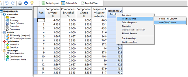 再び “Mix-a.dxpx” ファイルを開いてください。ツリー構造の Design ブランチで、最後の応答の列を右クリックします。メニューから “Insert Response” -> “After This Column” を選択します。