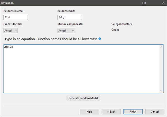“Next” をクリックし、Response Name には「Cost」 、および Response units には「$/kg」と入力します。次に、所定の領域に「.5b+.2c」と入力してください(1キロあたりの価格がアルコールは 0.50 ドル、尿素は 0.20 セント を表します- 水は実質的にコストがかからないものと仮定します)。