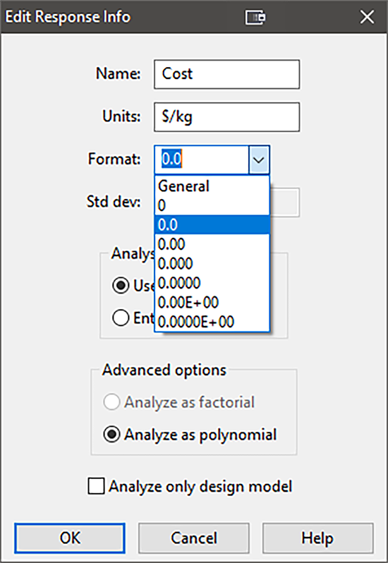 “Finish” をクリックして計算式を決定し、この混合計画におけるすべての配合のコストを計算します。これらをより見やすくするには、Response 3 列のヘッダーを右クリックして “Edit Info” を選択し、ドロップダウンリストの Format を “0.0” に変更します。そして、“OK” をクリックします。