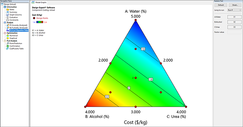 上記のコメントにもあるように、この事例では、価格が最も安い原料(この場合は水)の最大化を検討することをお勧めします。逆に言えば、配合の調製に非常に高価な原料が含まれている場合、そのような原料は出来る限り減らした方が良いのは明らかです。こうしたコストは、Design-Expert の数値計算による最適化の応答のひとつとして、わずかな手間をかけるだけで組み入れることができます。
