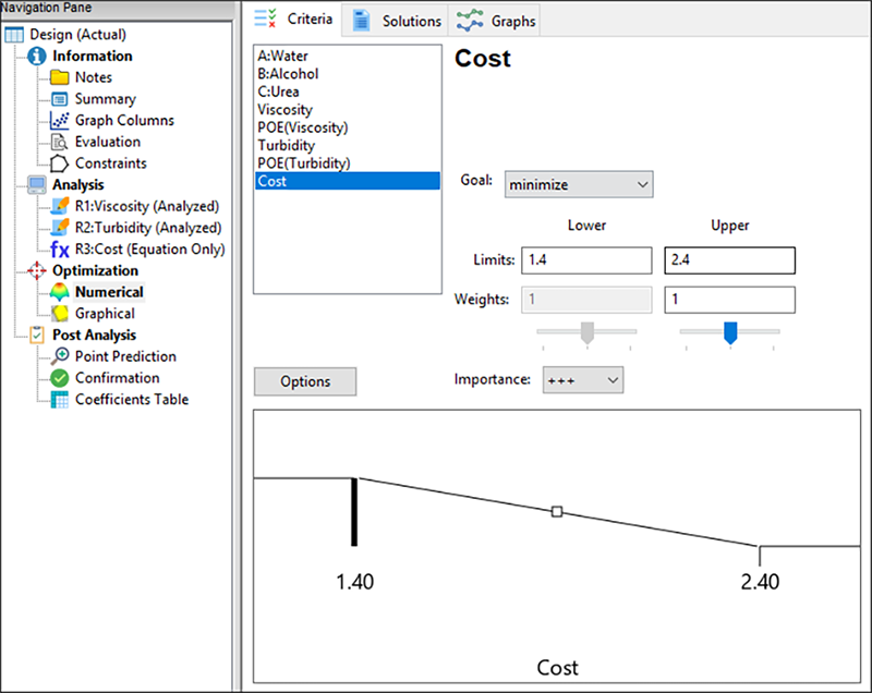 複数の応答最適化に、コストを組み入れる準備がこれで整いました。以下の図に示すように、Optimization の “Numerical” ノードに移動し、そこで “Cost” を選択したら、Goal を “minimize” に指定してください。