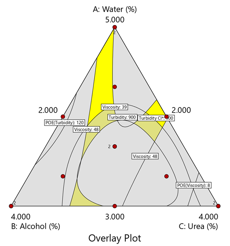 ここで、成分 A(water)および B(Alcohol)を変更しても、応答にはわずかな違いしか生じませんが、C(urea)を変更した場合は大きく変化することが分かります。