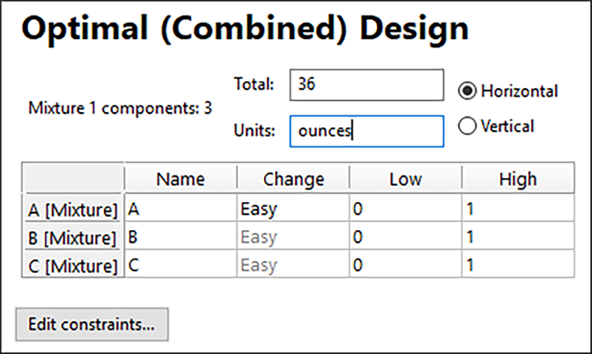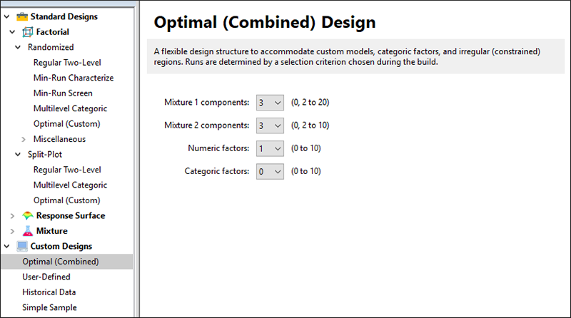 )をクリックします。下部にある Custom Designs セクションから “Optimal (Combined)” を選択します。Mixture 1 components のドロップダウンリストから “3” を選択します。次に、Mixture 2 components には “3” を、Numeric factors には “1” を選択します。次のページに進むために、右下の “Next” ボタンをクリックします。