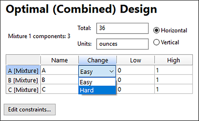残りの変更されていないレシピにも、この合計 36 オンスが繰り返して追加されるため、どの試行も割合は同じになります。ケーキの混合物は、この計画における HTC 因子であるため、ドロップダウンリストを使用してA 行の Change 列を Easy から “Hard” に変更します。混合物はすべての成分が Easy または Hard のどちらか一方で統一する必要があるため、最初に変更した Hard に準じて他のすべても Hard に変更されます。